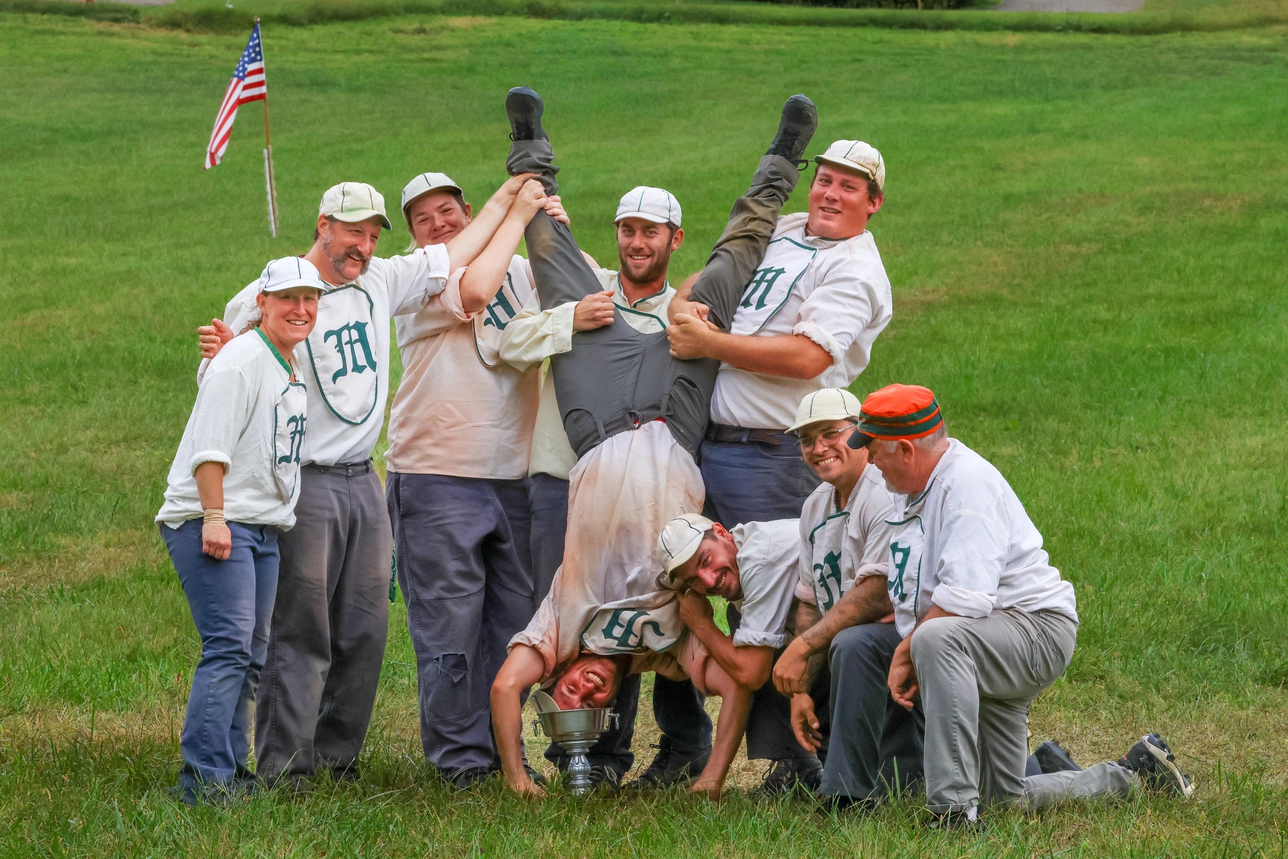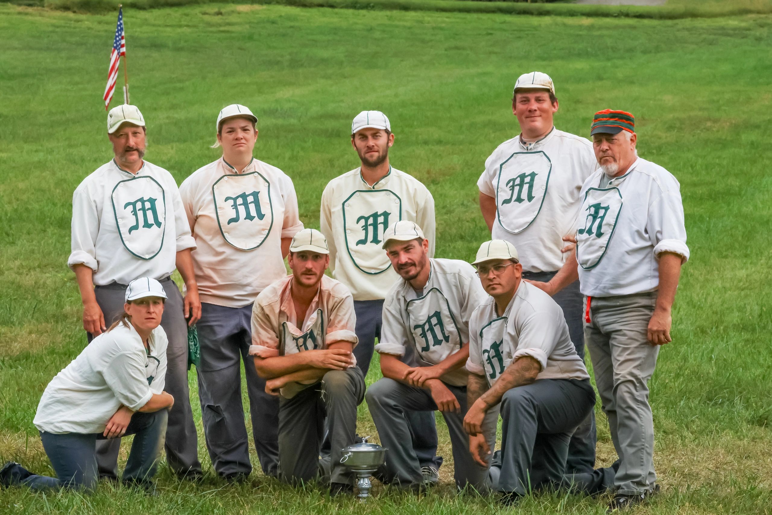 Our team was established in 1999 as an out reach of the program at Old Bethpage Village Restoration. We have traveled to 17 different states and Canada playing base ball by different rules of the 19th Century.